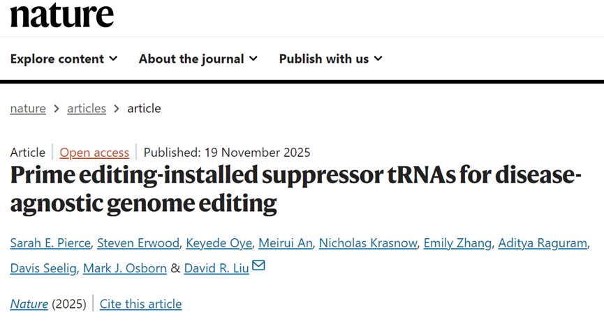 [1] Pierce, S.E., Erwood, S., Oye, K. et al. Prime editing-installed suppressor tRNAs for disease-agnostic genome editing. Nature (2025). https://doi.org/10.1038/s41586-025-09732-2