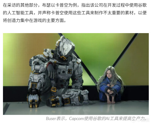 Buser 还拿卡普空做例子,称其会用谷歌 AI 工具快速生成大量创意,再由美术总监筛选后交给团队继续打磨,把精力留给更重要的角色、主场景和关键内容。